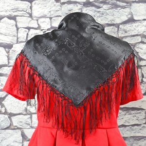 - Blue and red patterned bodice with herringbone dark blue skirt