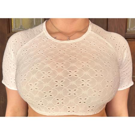 White blouse featuring lace and embroidery around the neck and sleeves.