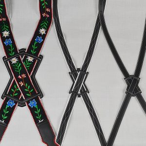 These suspenders come complete with breastplate and scalloped straps. To determine the length you need to order, measure from waist in front, up over the shoulder, to opposite side on the back. Order by centimeters. Made in the USA.
