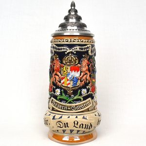 Embroidered Oktoberfest Beerstein design on a light grey crew neck sweatshirt. Embroidery by Ernst Licht.