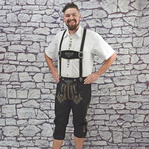 Men’s traditional German flannel shirt featuring a blue plaid fabric with brown accents and edelweiss embellishment.