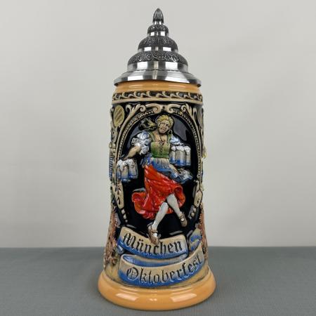 - Body depicts a beermaid holding liters of beer and dancing, with musicians to either side