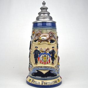 - Solid pewter lid featuring two men carrying a fire-hose wagon
