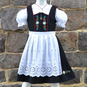 Children’s German dirndl in green print fabric, includes blouse and apron.