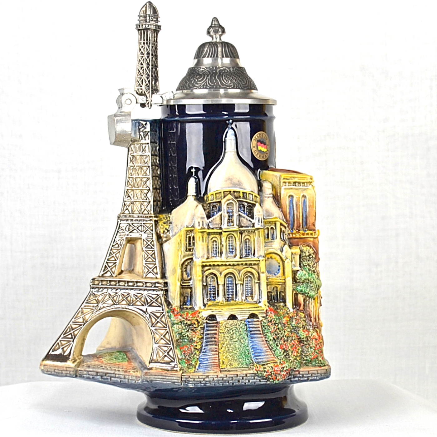 Tags: 1/2 Liter Stein, 3D Paris City, Beer Stein, German Made, German Stein, hand painted, Handcrafted, handmade, King Werk, Ornamental Lid, stein