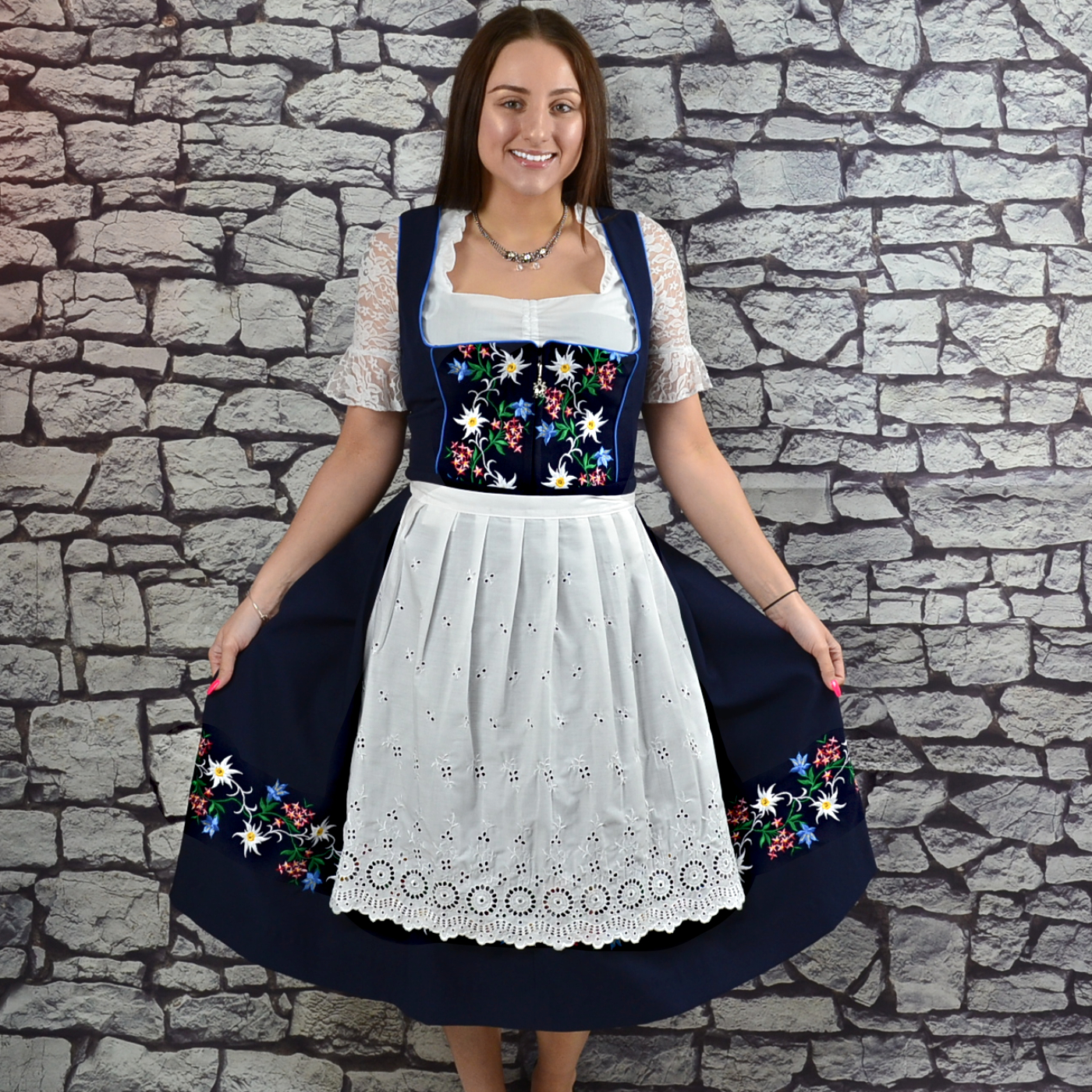 Shipping Not IncludedThis Alpine Dirndl has edelweiss, enzian and almrausch floral embroidery.