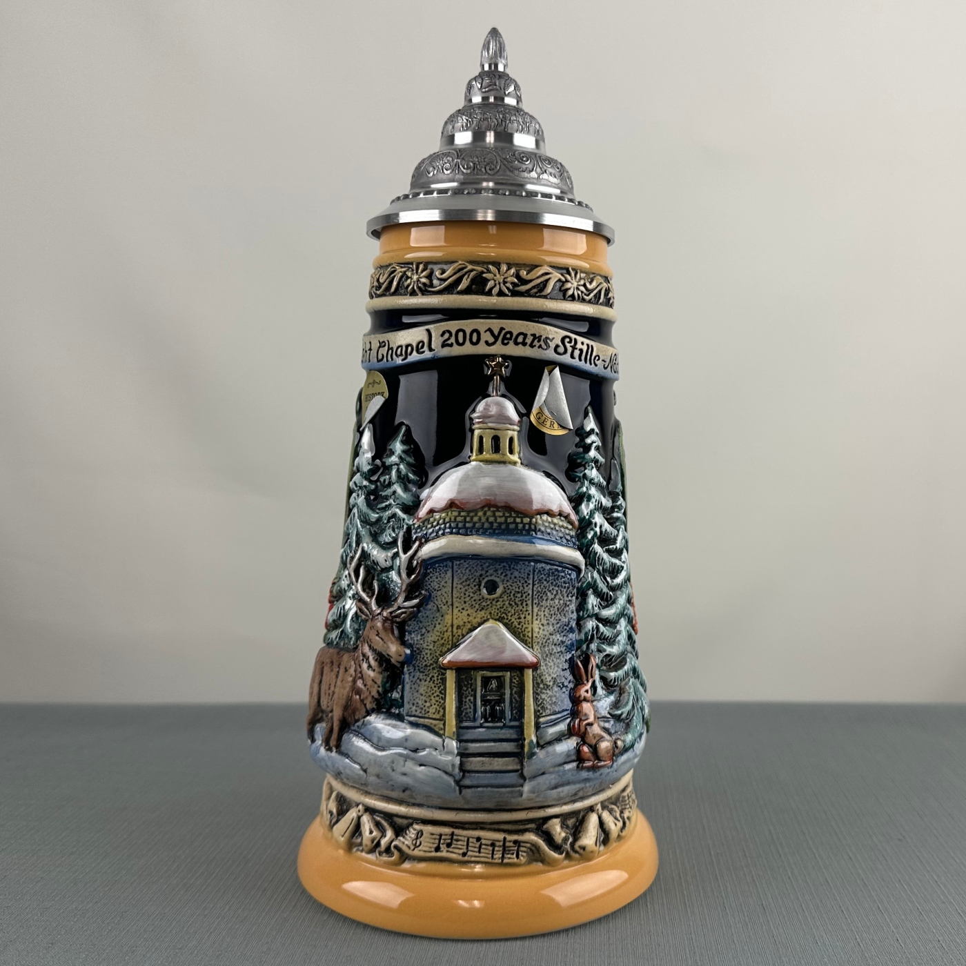 - On body of stein is portrayed a chapel, snow, evergreen trees, alpine flowers, stag and rabbit