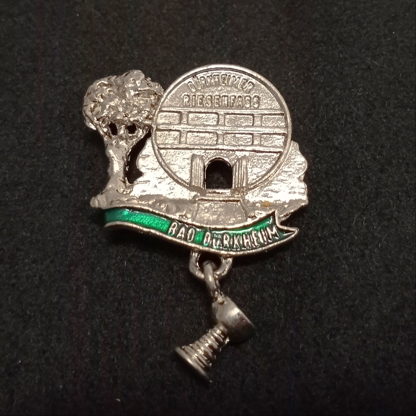 Shipping Not IncludedGerman hat pin depicting beer barrel with hanging cup. Banner says “Bad Durkheim”. Imported.