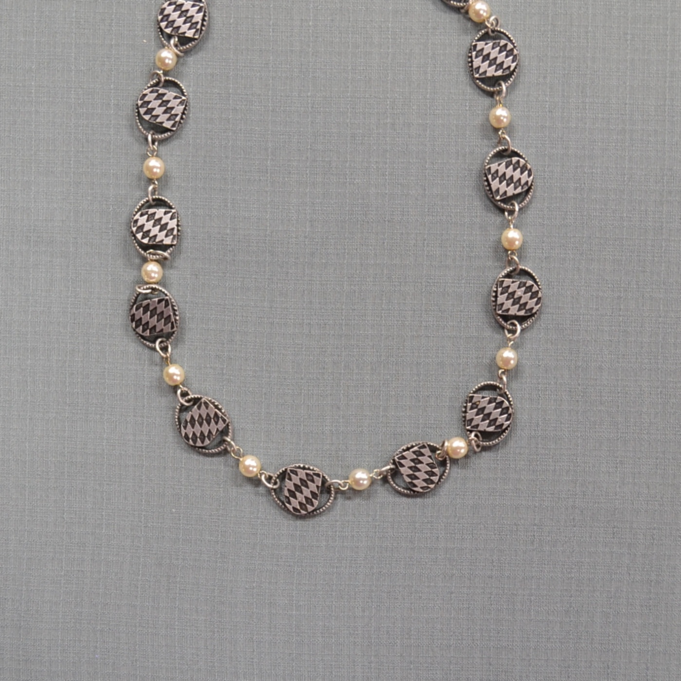 Necklace features pewter colored Bavarian shields with pearls along the entire piece.