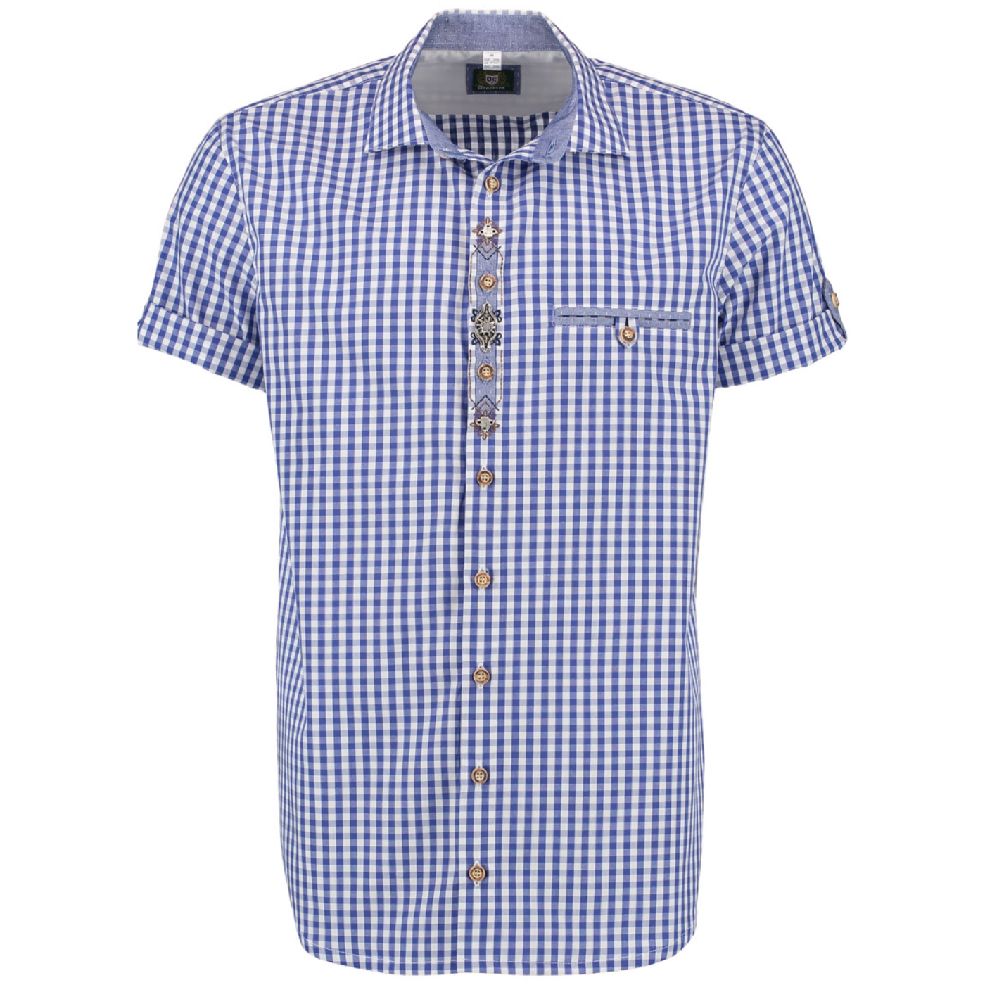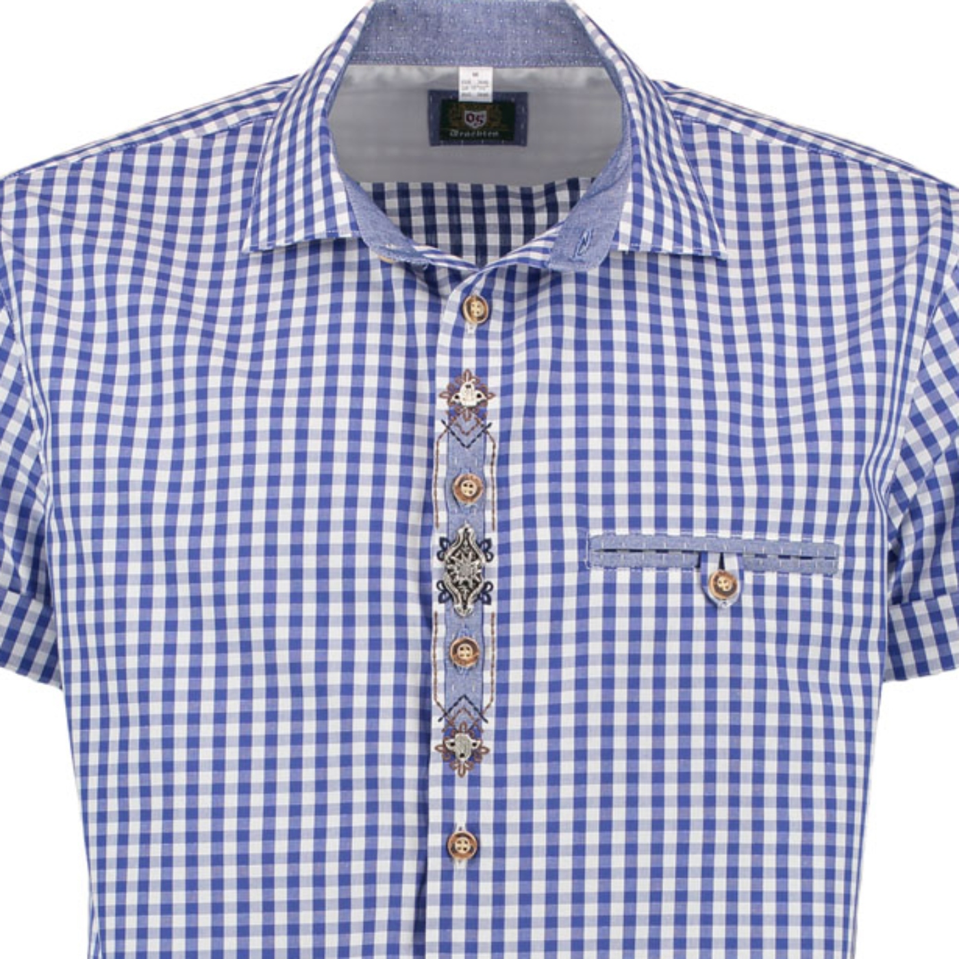 This men’s blue checkered short sleeve shirt would look great coupled with lederhosen or jeans.