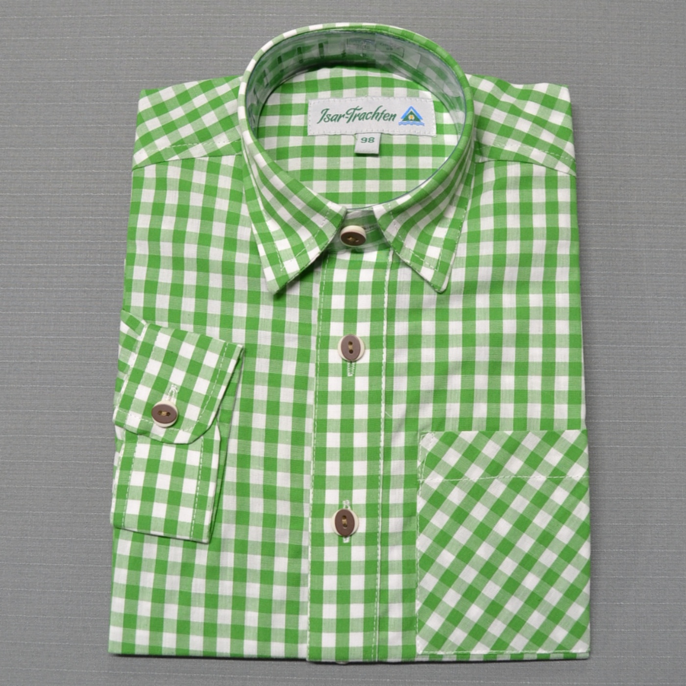 - This boy’s green checkered shirt is imported from Germany.