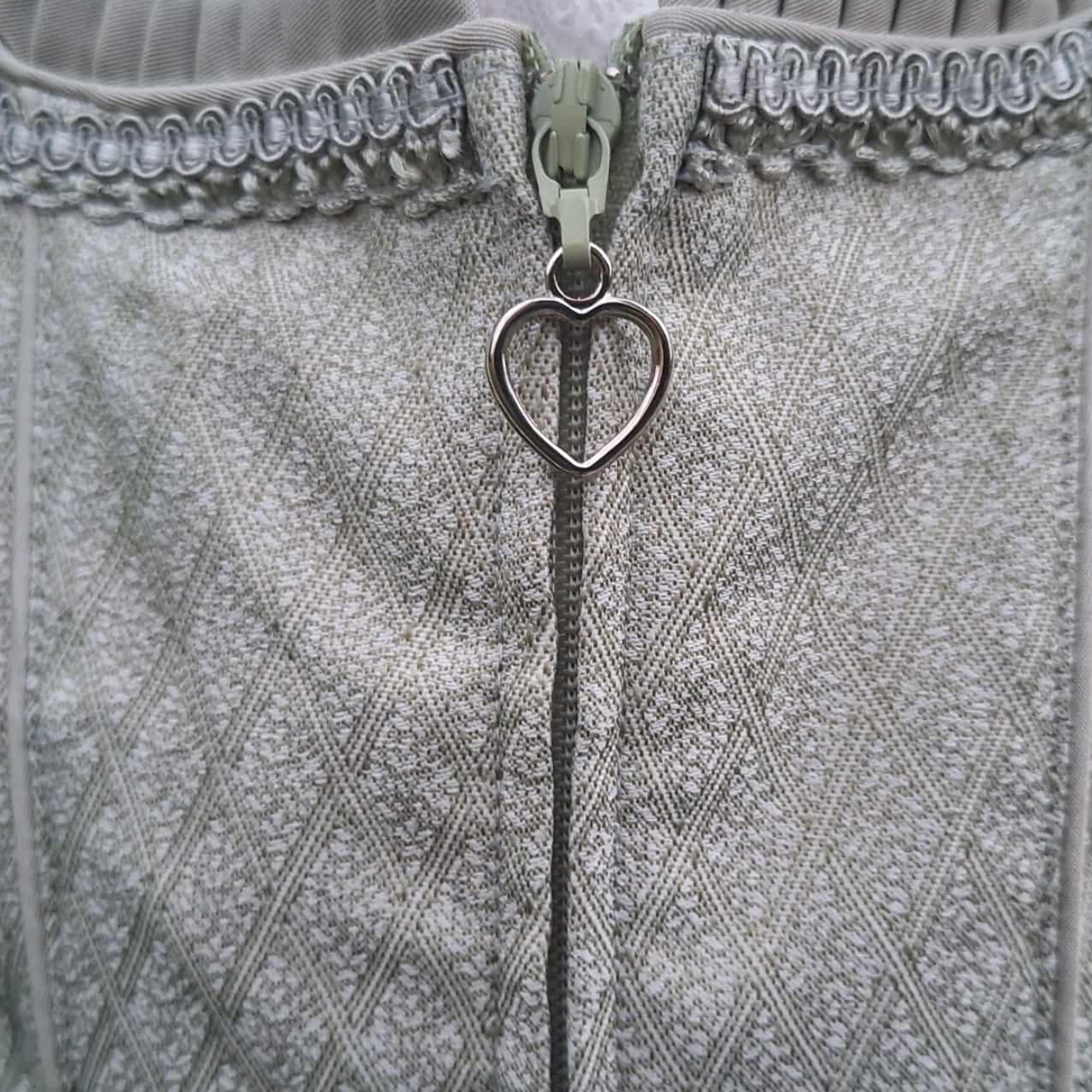 - Zipper up front with heart shape zipper pull
