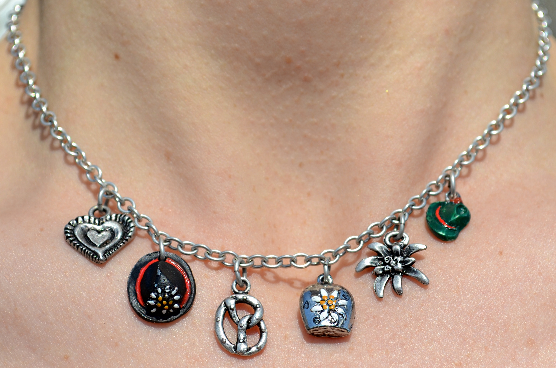 Short chain charm necklace featuring heart, pretzel, 2 hats, cow bell, and edelweiss charms. Imported from Germany.