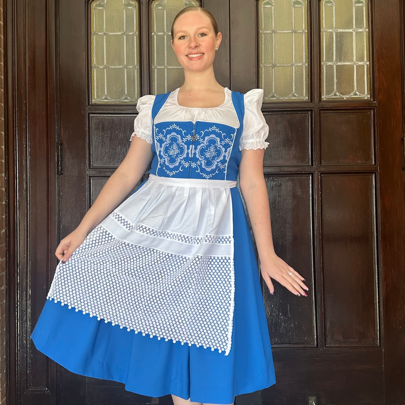 Shipping Not IncludedCiara embroidered dirndl in Bavarian blue with blouse and apron.