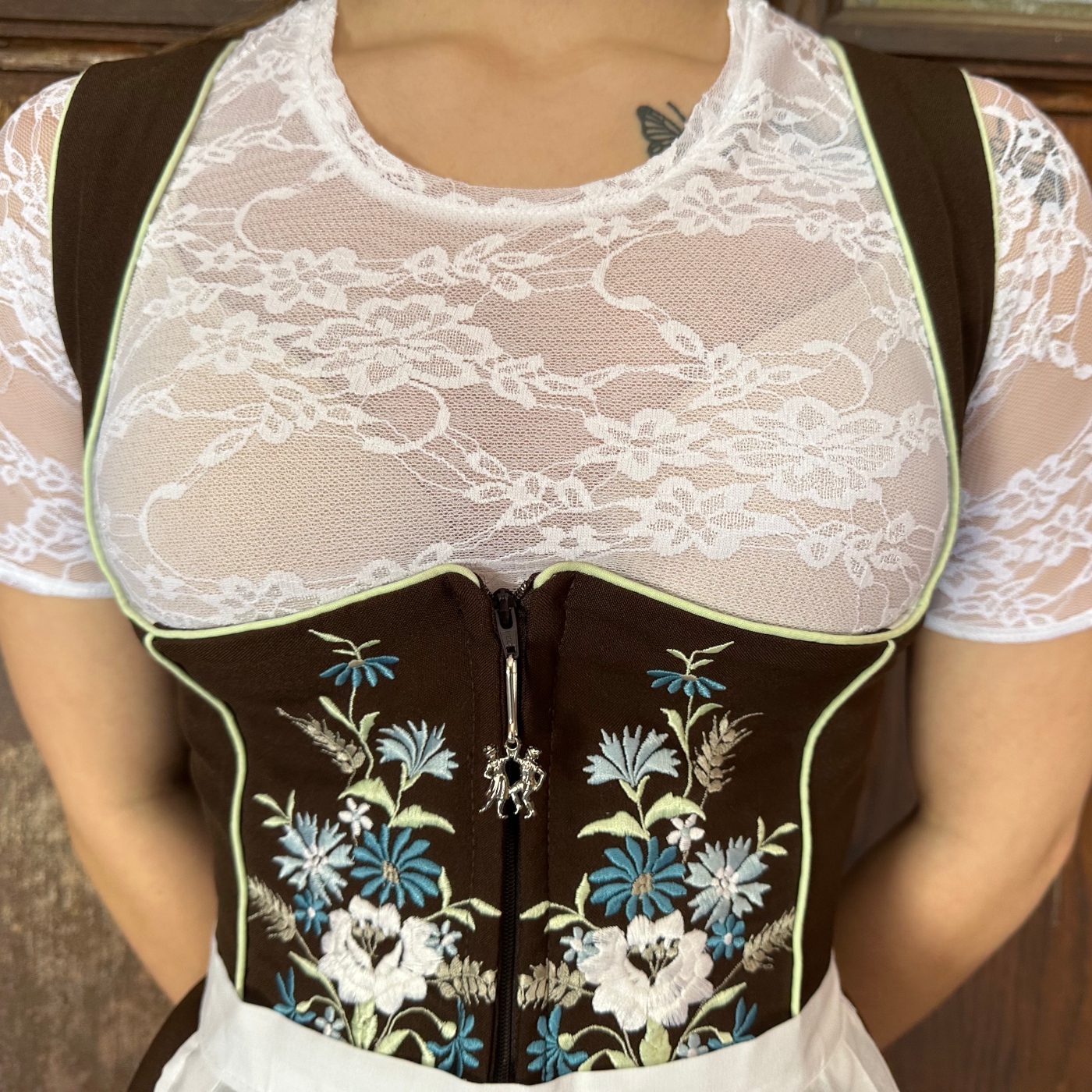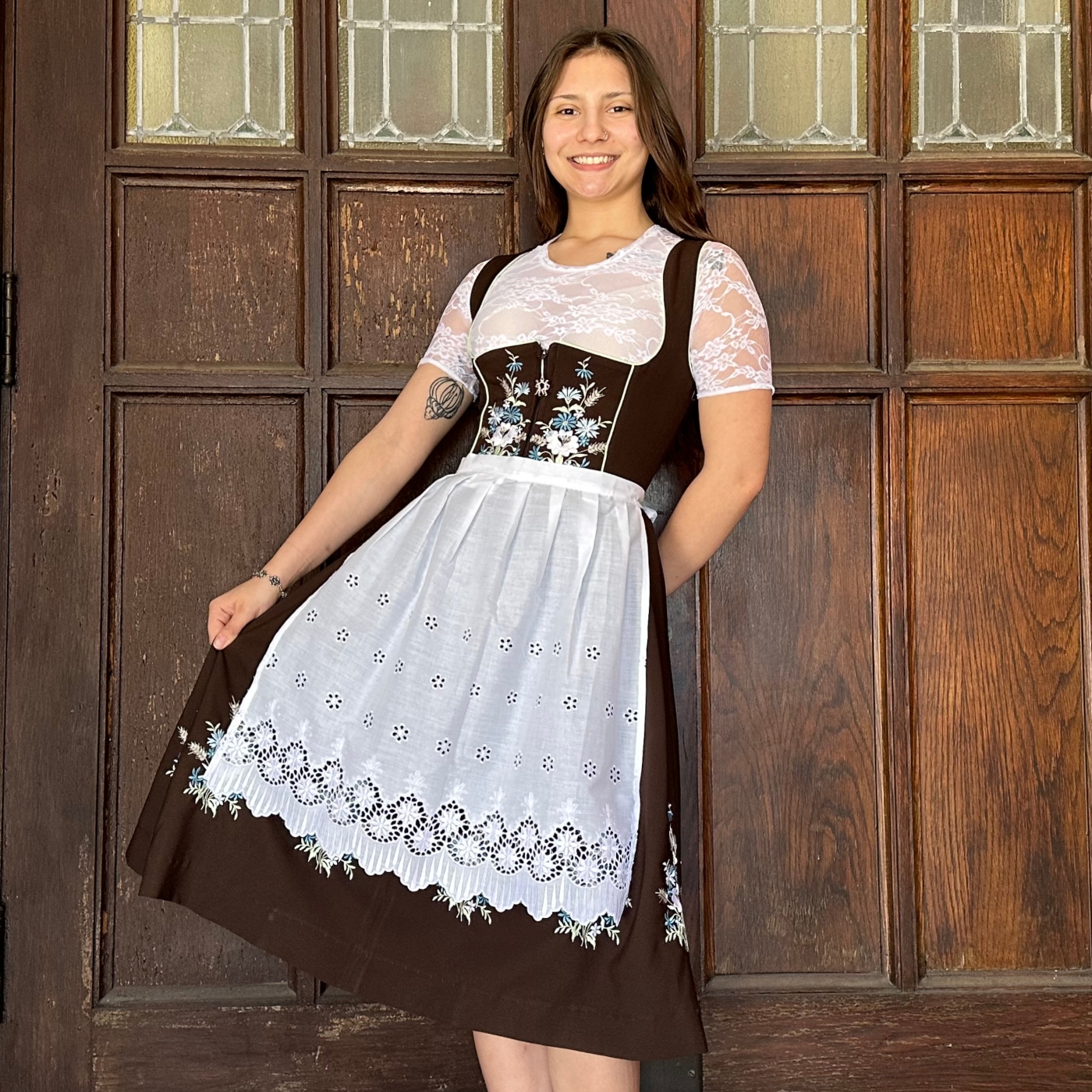 Shipping Not IncludedBrown dirndl with blue, white, and tan Cornflower embroidery.