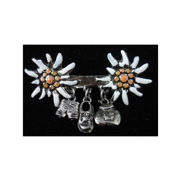- Double painted edelweiss pin with boot, hat, and heart pendants.