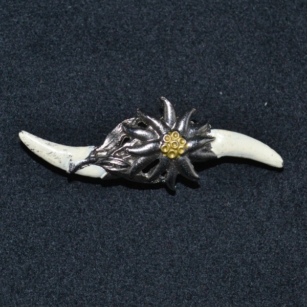 Pin features painted teeth with edelweiss. Imported from Germany. Measures 2 1/8″ by 3/4″.