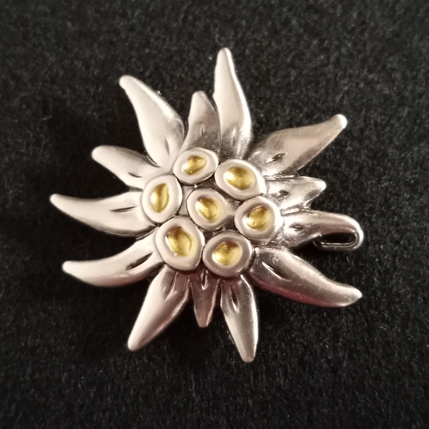 German edelweiss hat pin, pewter color metal with gold color accents in the center. Measures 1 1/8″ across . Imported.