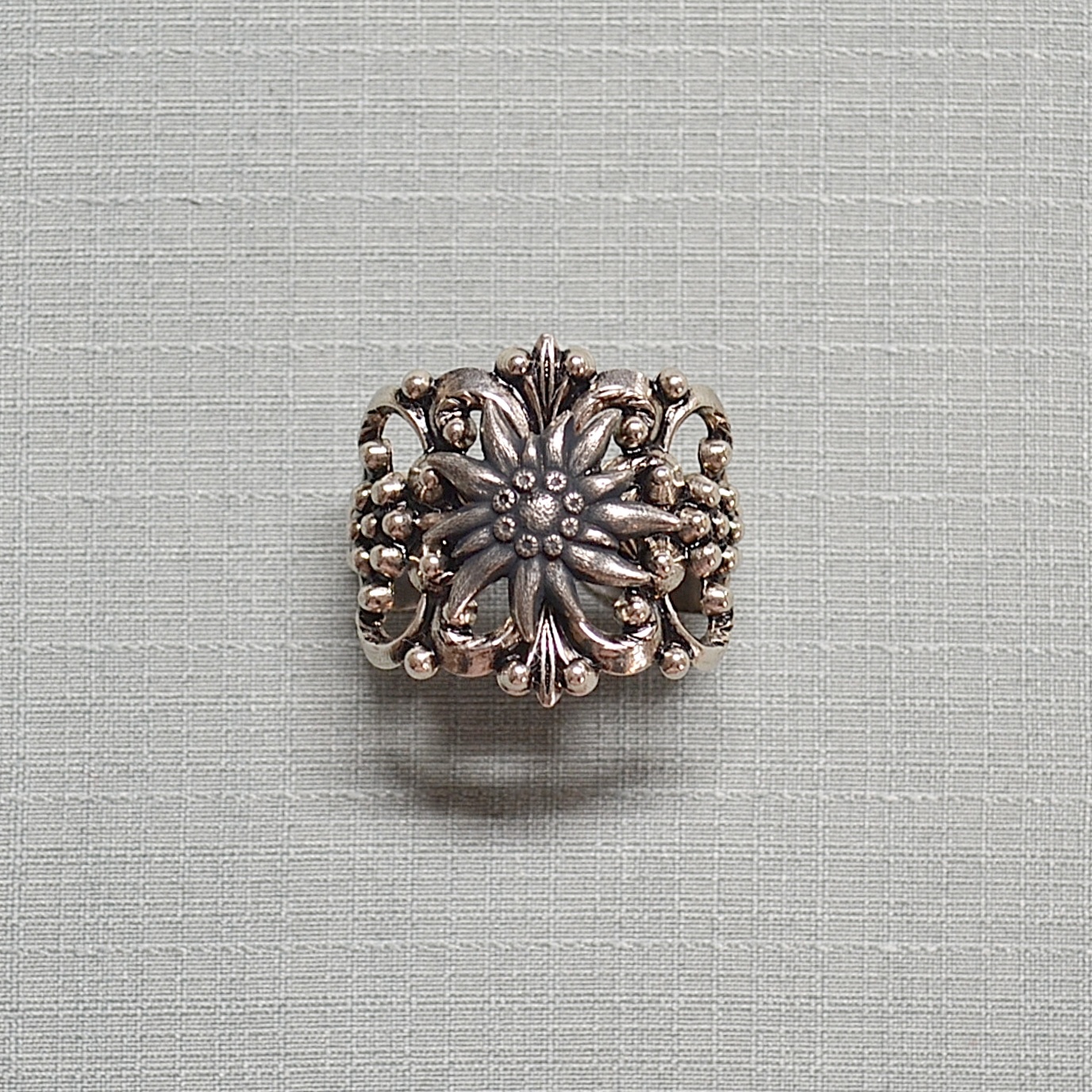 Shipping Not IncludedTie Ring with Edelweiss flower and filigree adornments.