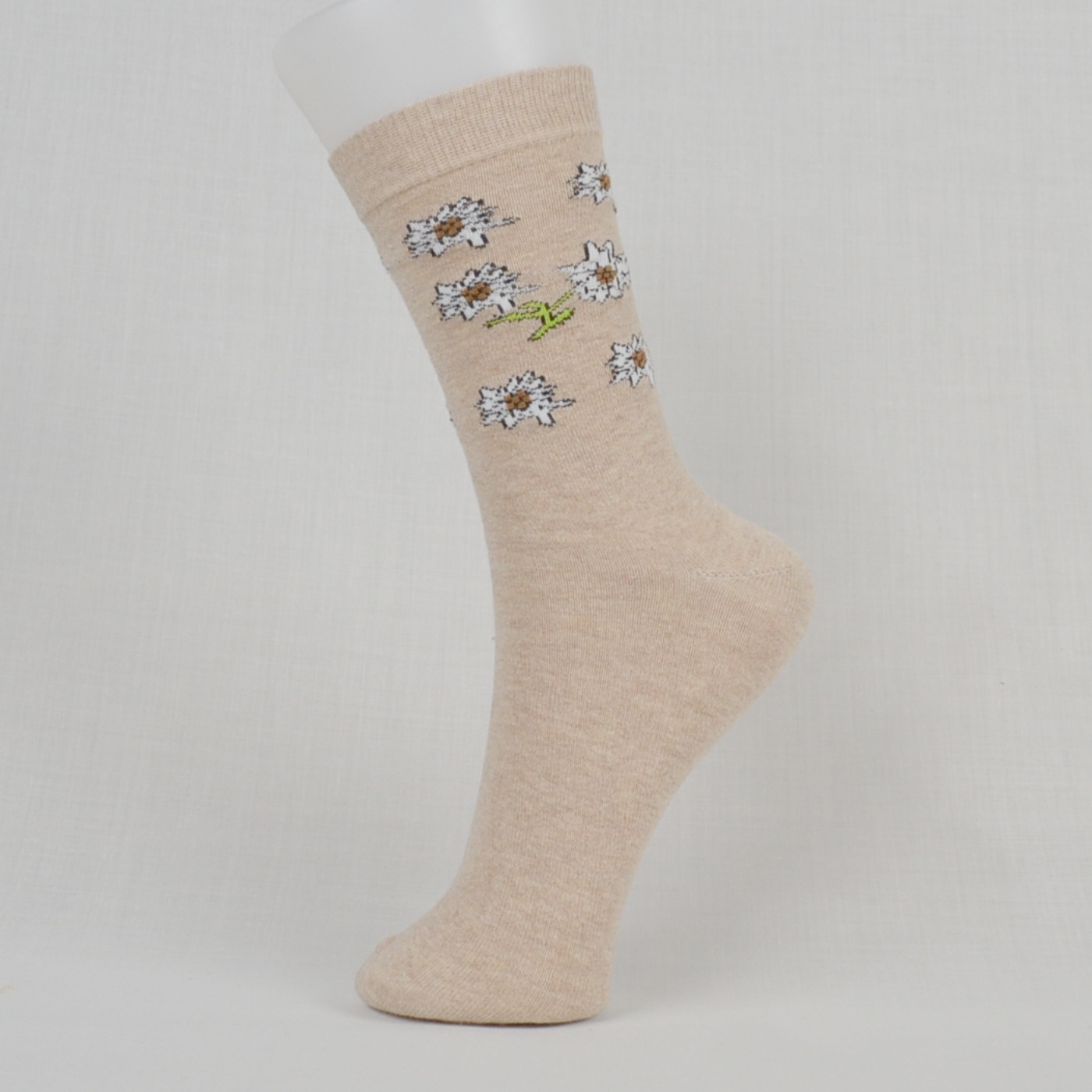 - White edelweiss flowers along the leg of socks