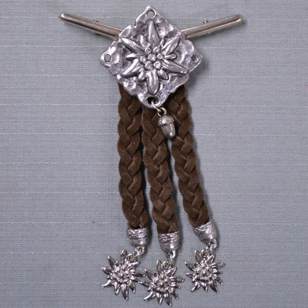 Three strands of braided leather with decorative charms. Charms vary by style- either acorns or edelweiss. Please call for clarification if desired. Approximately 3 inches wide and 4 1/2 inches long. Imported from Germany.