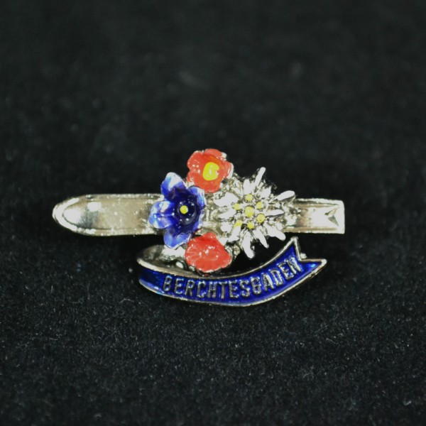 Ski pin with edelweiss with flowers. Also has “Berchtesgaden” banner. Imported. Measures 1 1/2″ by 3/4″.