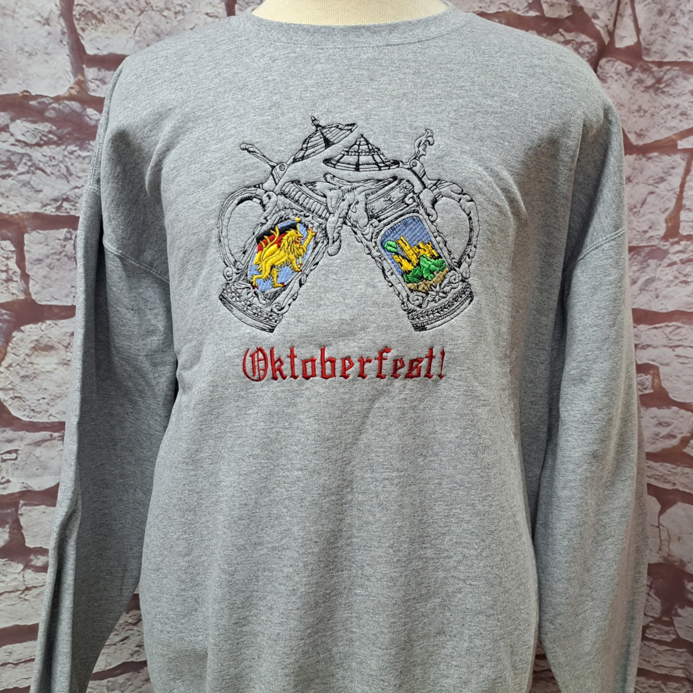 Embroidered Oktoberfest Beerstein design on a light grey crew neck sweatshirt. Embroidery by Ernst Licht.