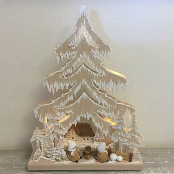 - The tree contains small light bulbs powered by an electric cord.