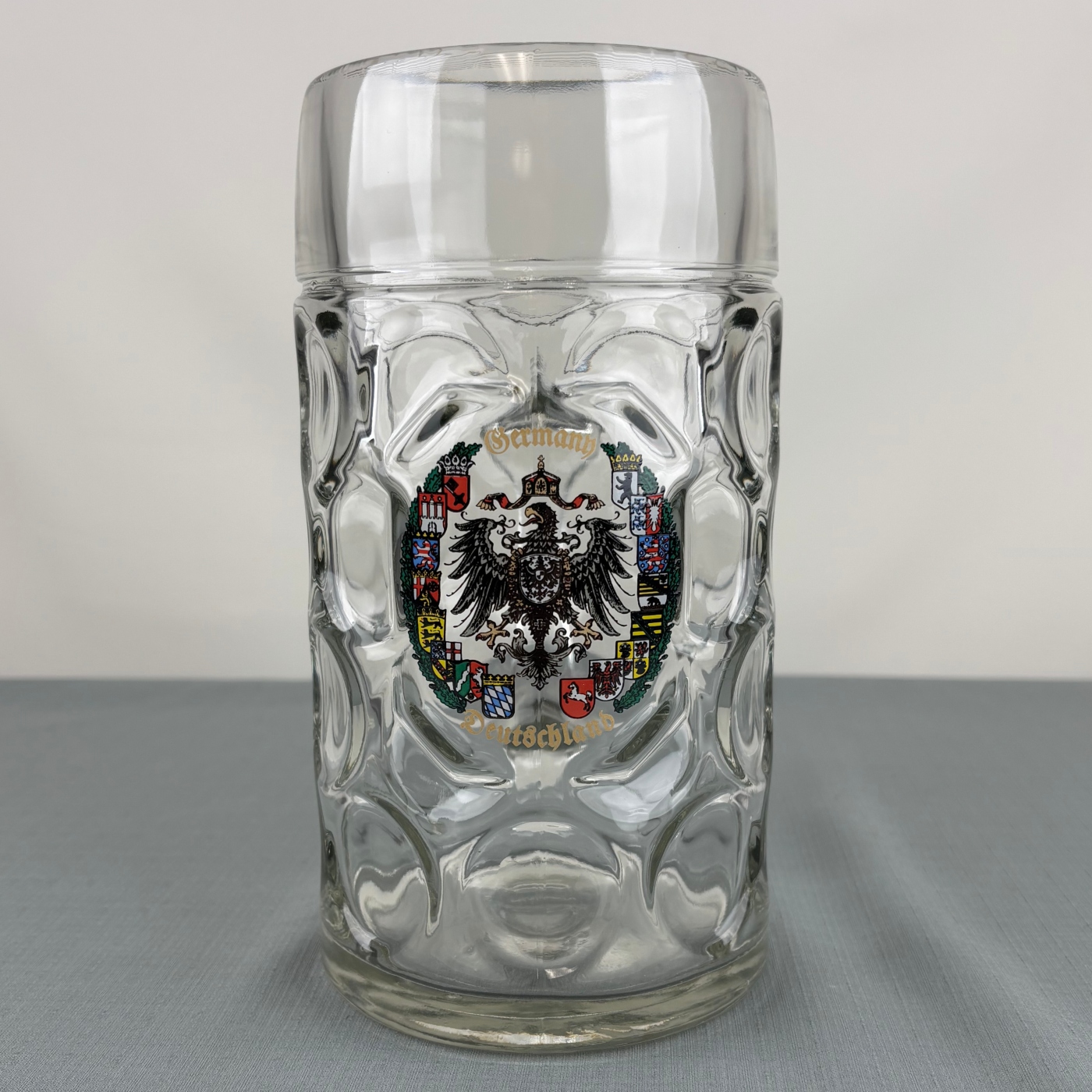 Shipping Not IncludedGlass beer mug with textured sides. Features eagle decal on front of mug. Measures 1 liter. Imported from Germany.