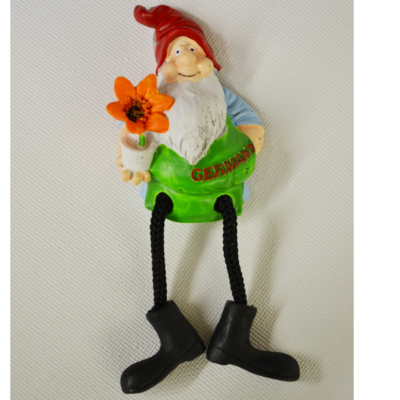 - Delightful German magnet featuring a red-capped gnome holding an orange flower.