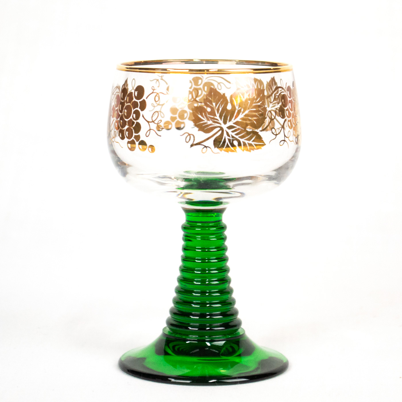 Shipping Not IncludedBockling gold rimmed wine romer with green stem.