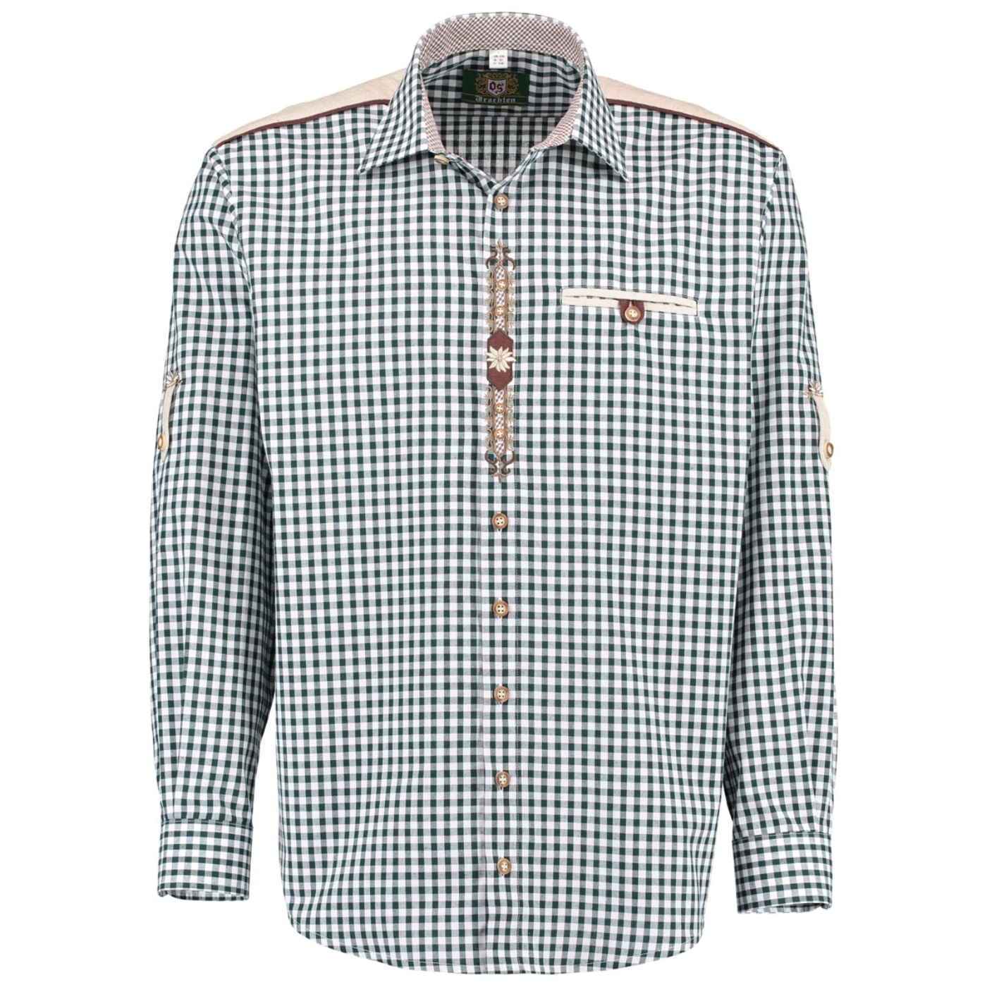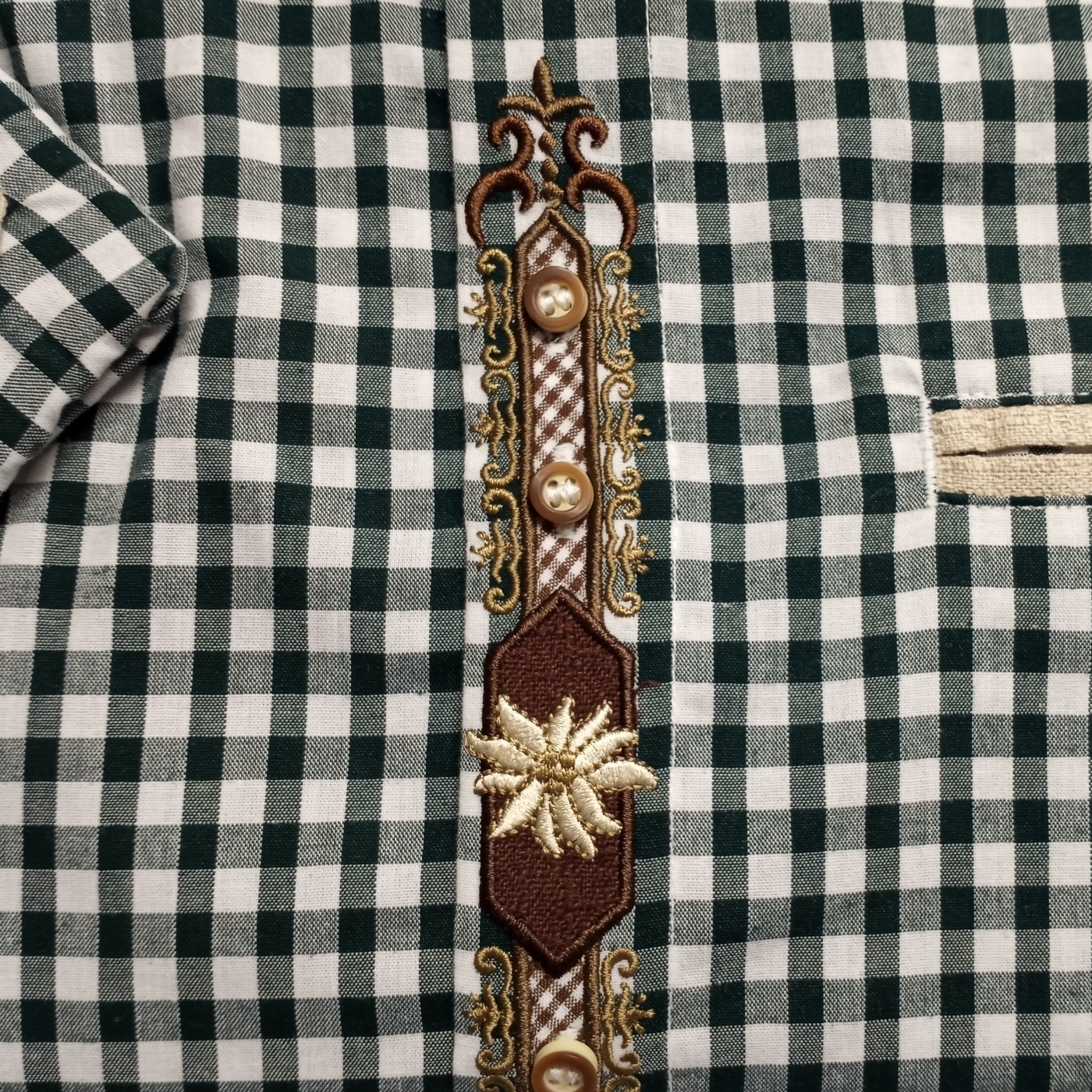 Shipping Not IncludedMen’s traditional German shirt featuring a dark green checked pattern with beige shoulders and edelweiss embroidery.