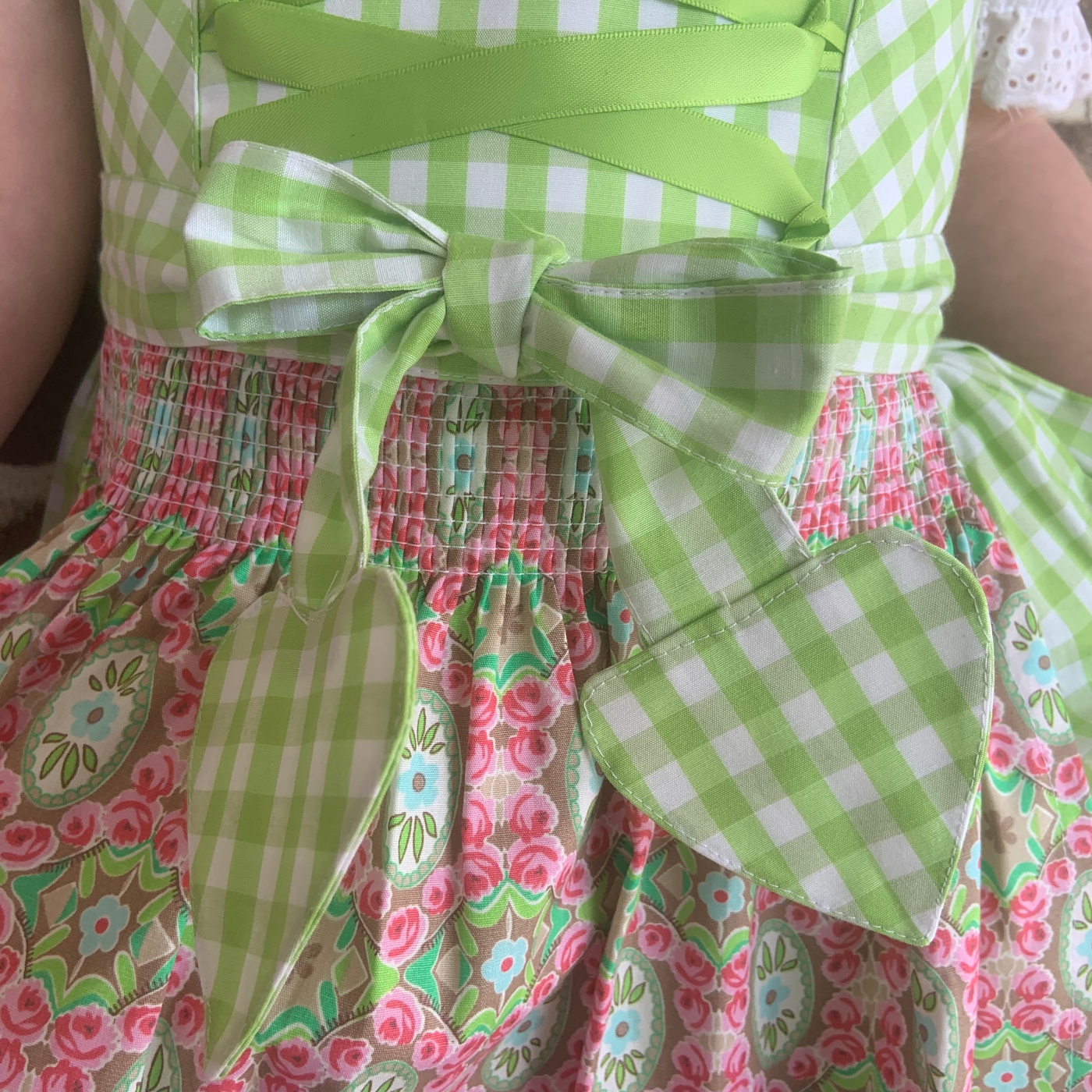 - Bodice and skirt are bright lime green checkered pattern with pink checkered detailing around skirt bottom.