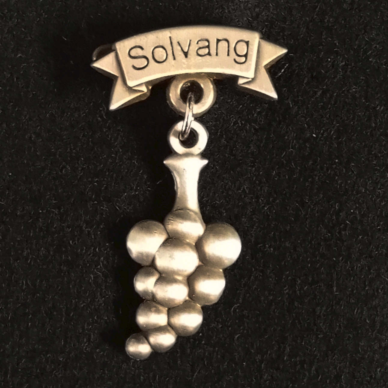Hanging grapes hat pin with “Solvang” banner. Measures 1″ by 1 5/8″ .
