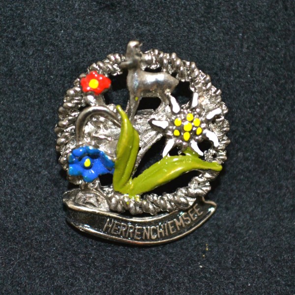 Shipping Not IncludedPainted circular Herrenchiemsee hat pin with stag and flowers. Imported. Measures 1″ by 1″.