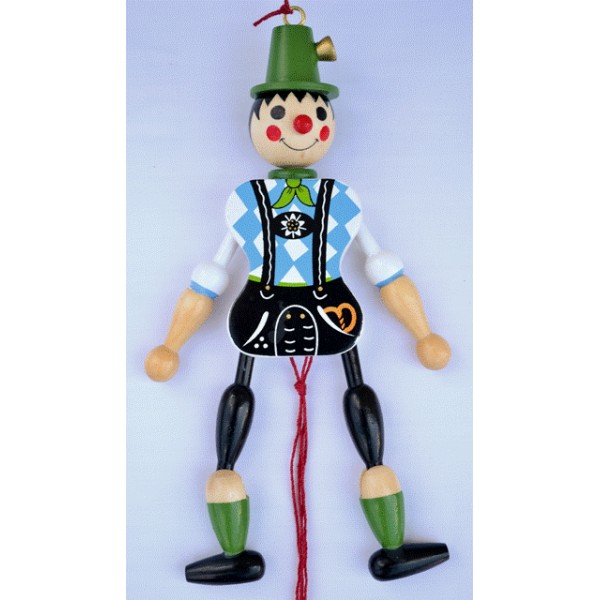 Shipping Not IncludedJumping jack man with painted lederhosen and blue/white checkered shirt. Features red, white, green, and black colors. Measures 7 in length. Pull strings shown on photo make the “jack” “jump” (limbs move). Hand crafted and imported from Germany.”