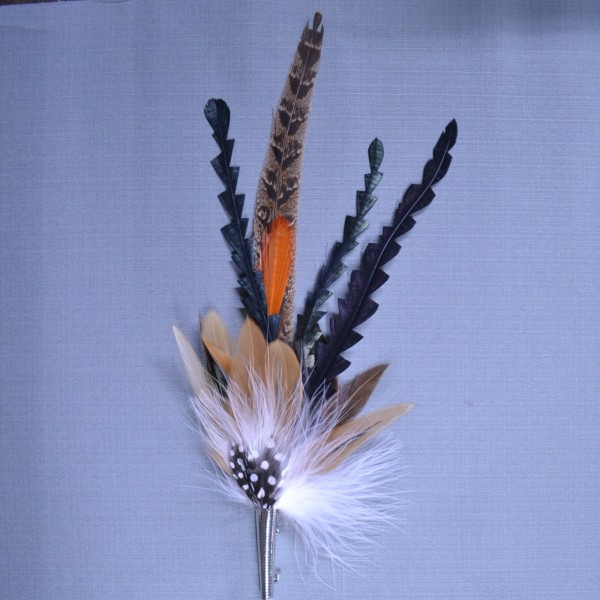 - Large feather with white bottom featuring tan, orange and green feathers.