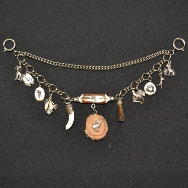 Shipping Not IncludedCharms consist of a variety of German themed items. 11 Charms total- gamsbart, ram, deer’s tooth, deer’s horn, turkey, boar, deer antler, lion and backpack. 12 inches in length. Made in Germany.