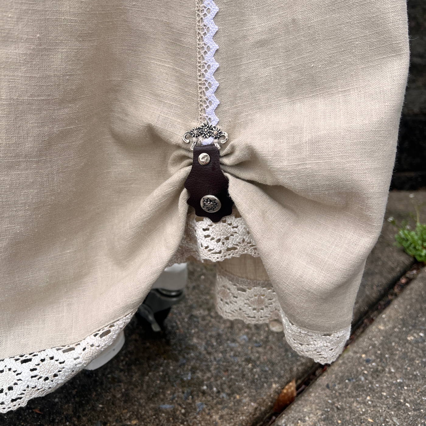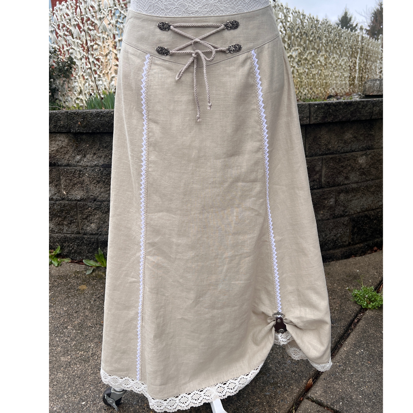 Long tan skirt. Pairs nicely with a body suit or blouse.
