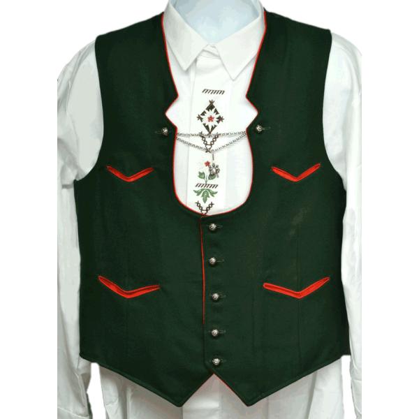 Style 18-7 Men’s Prien vest has swallow or v shaped pockets. Made in the USA. Available in green or red, polyester or wool. The 18-7 in wool is made using imported loden fabric trimmed (100% wool, 100% Acetate lining, black satin back). The 18-7 in polyester is made using 100% polyester fabric (black polyester back). A short version of this vest is available on a made-to-order basis. Made in the USA. Select sizes are made-to-order and require 4-6 weeks for manufacturing.