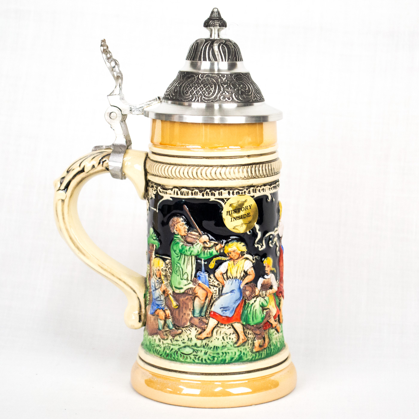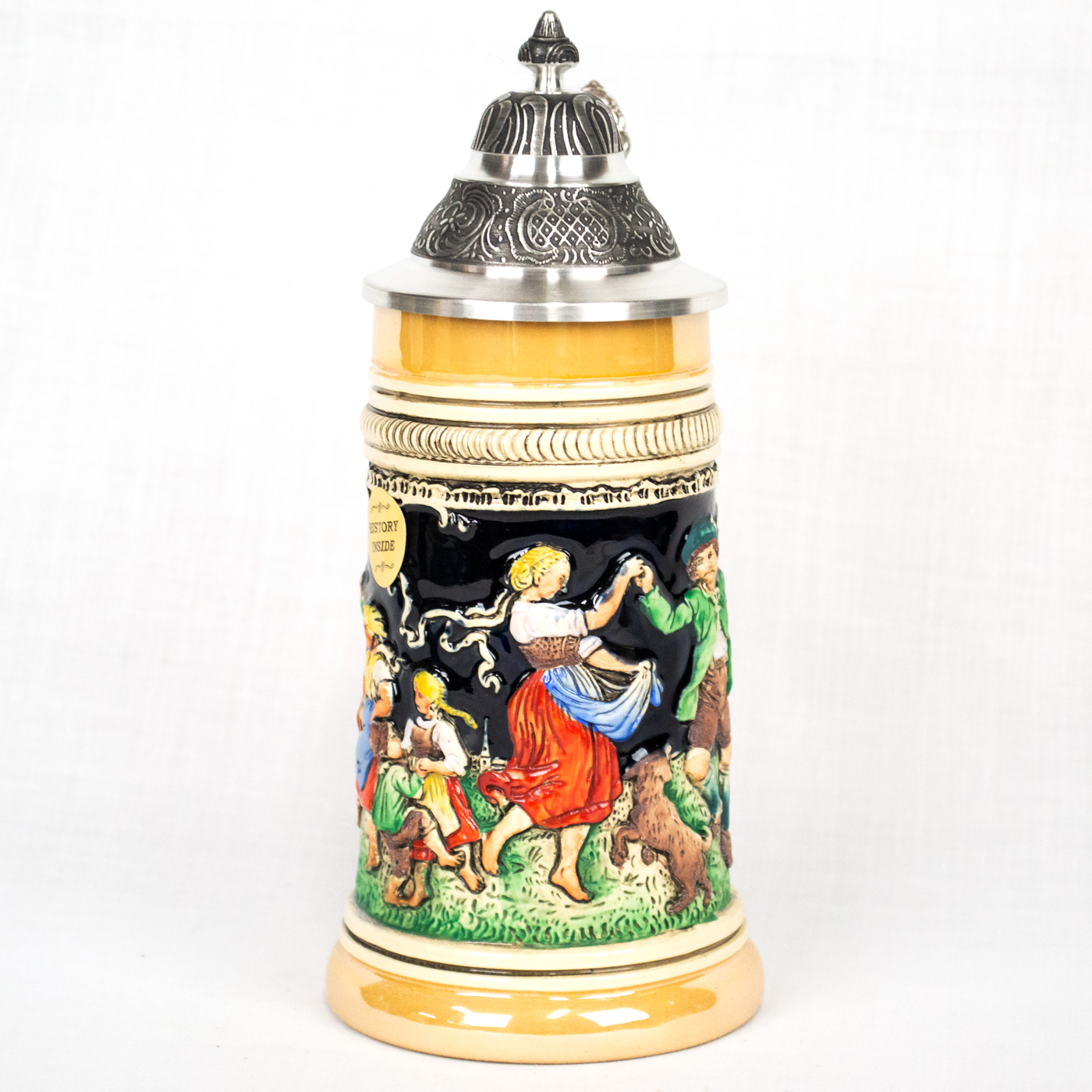 - The body of the stein shows a scene of men and women in dirndls and lederhosen, children, and dogs dancing around merrily