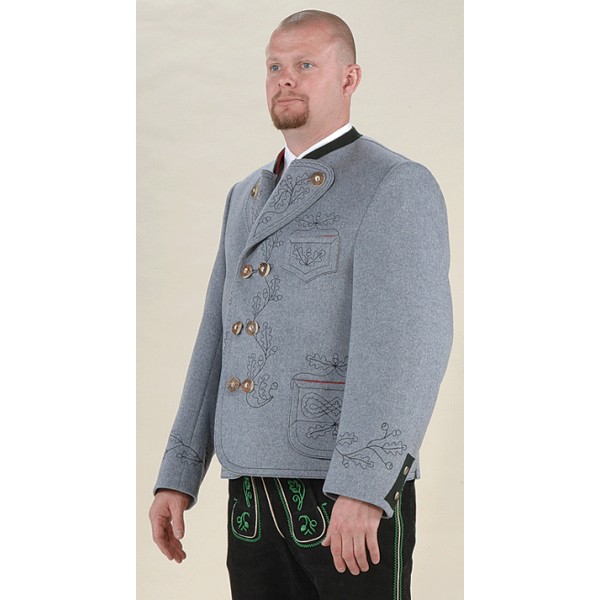 This Miesbacher jacket is made from 100% virgin wool – Gray loden fabric with elaborate machine embroidery. Long length in stock. This style jacket with shorter length sleeves is being discontinued. They are still available via special order only and can take up to 6 months to receive. Made in Germany.