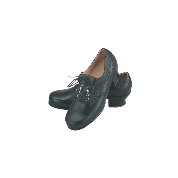 Shipping Not IncludedBlack leather uppers with shoe lace closure and long fold-over tongue for neatness. Genuine leather soles with 1 1/4″ heels and metal cleats for proper schuhplattler tapping and dancing. Please order American size. Made in Germany. Manufactured by B. Frey & Sohne.