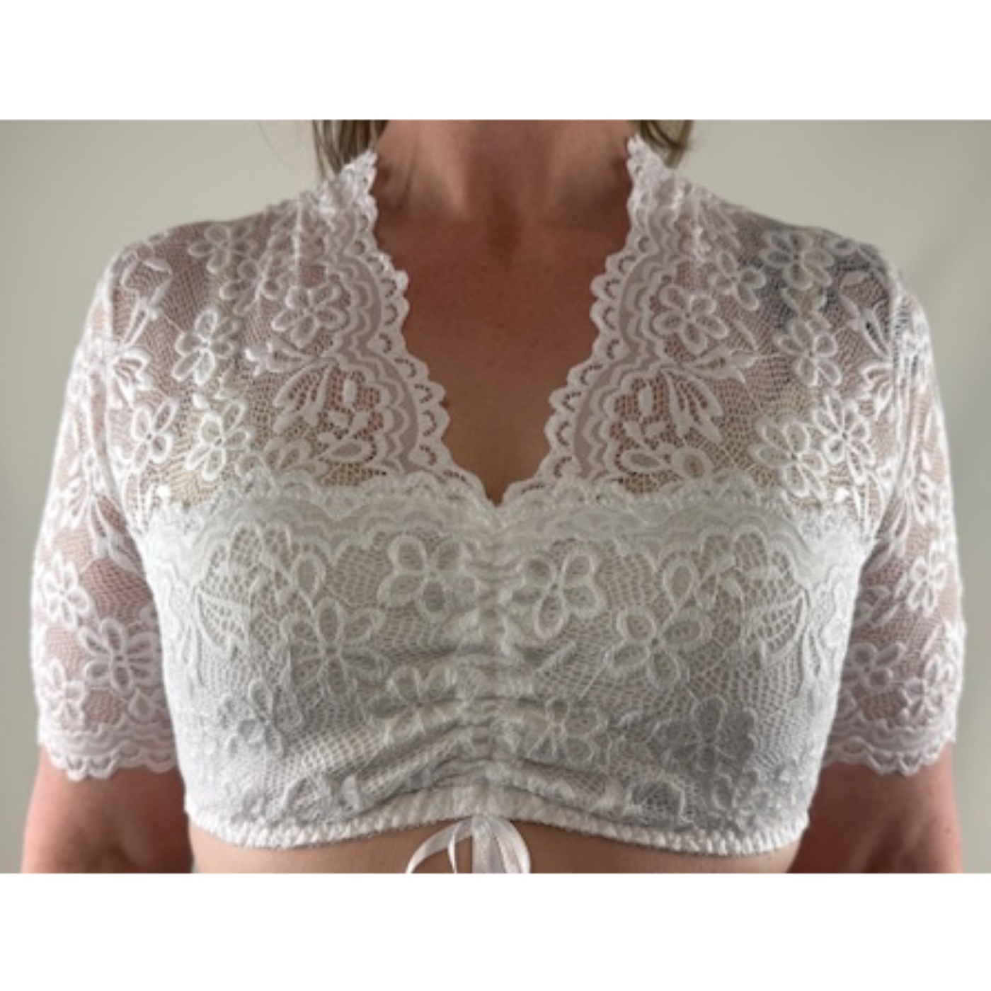 Shipping Not IncludedMinna short lace blouse with flower detailing is the perfect blouse to pair with any dirndl.