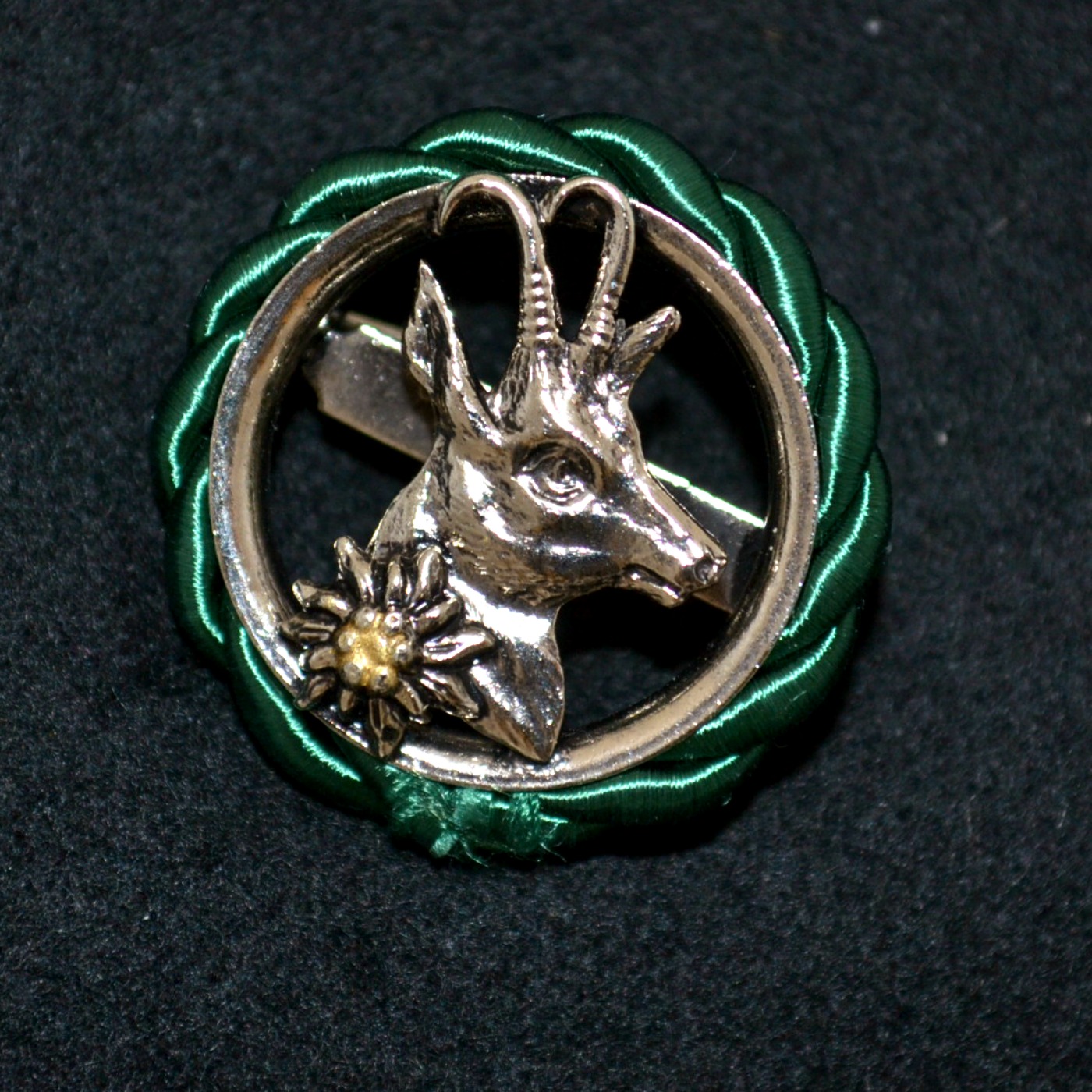 Green circular hat pin with goat and edelweiss in the center. Imported. Measures 1 1/8″ in diameter.