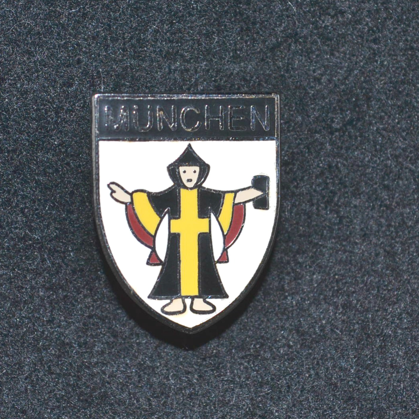 Pin features “Munchen” with monk coat of arms. Imported. Measures 1/2″ by 3/4″.