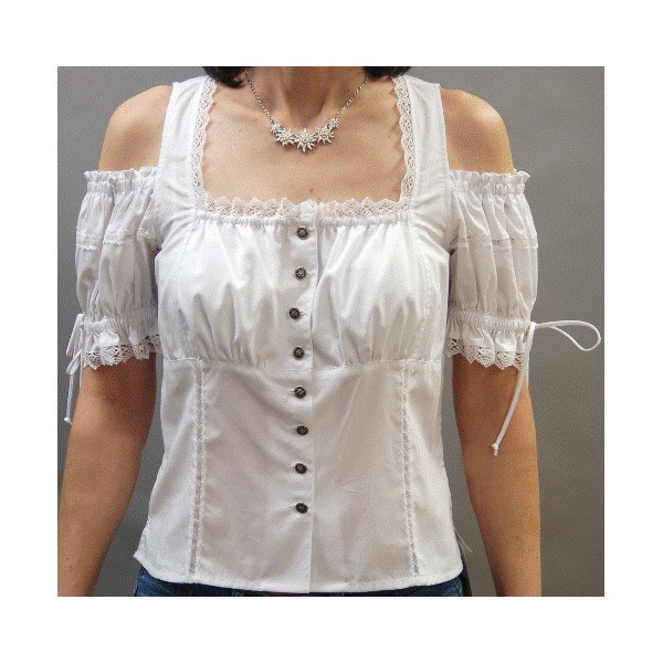 Off the shoulder shoulder blouse featuring buttons going down the front, and puffed sleeves with a tie up option.