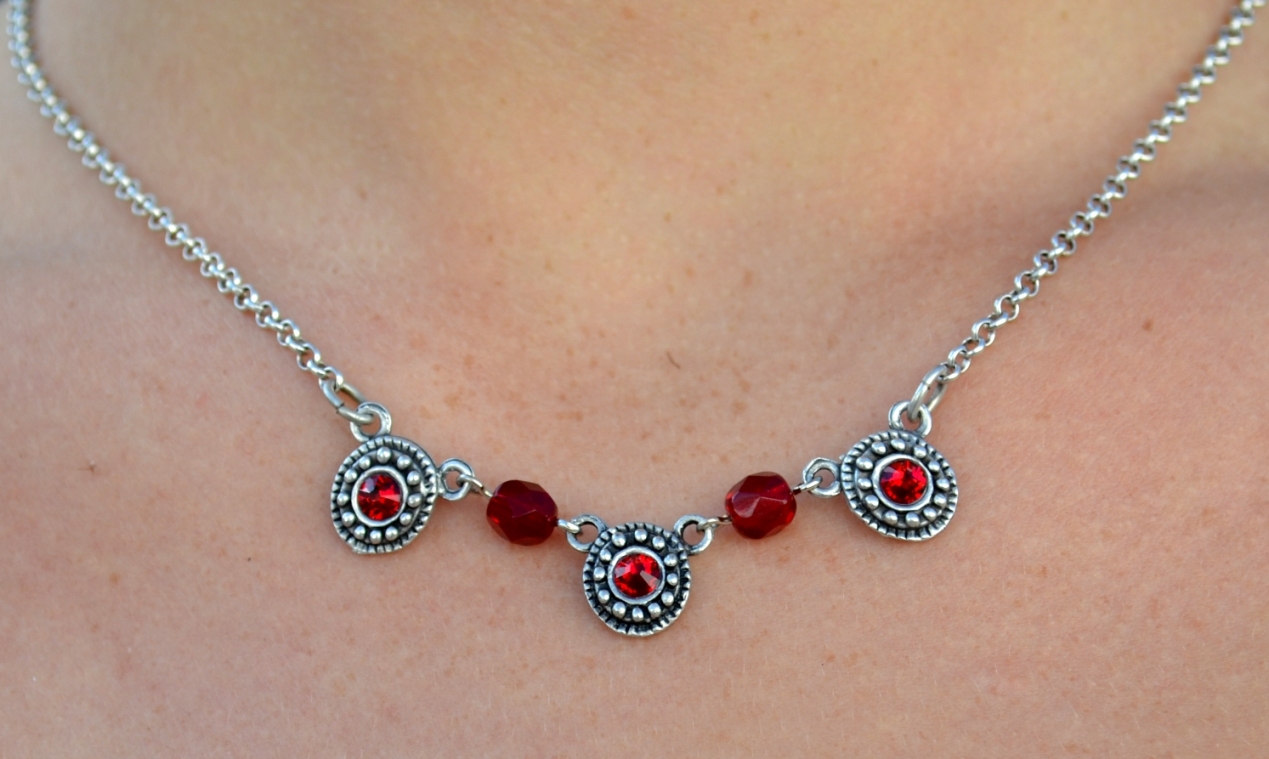 Silver necklace with red gems inside 3 separate circular pieces. Features lobster clasp enclosure. Imported from Germany.