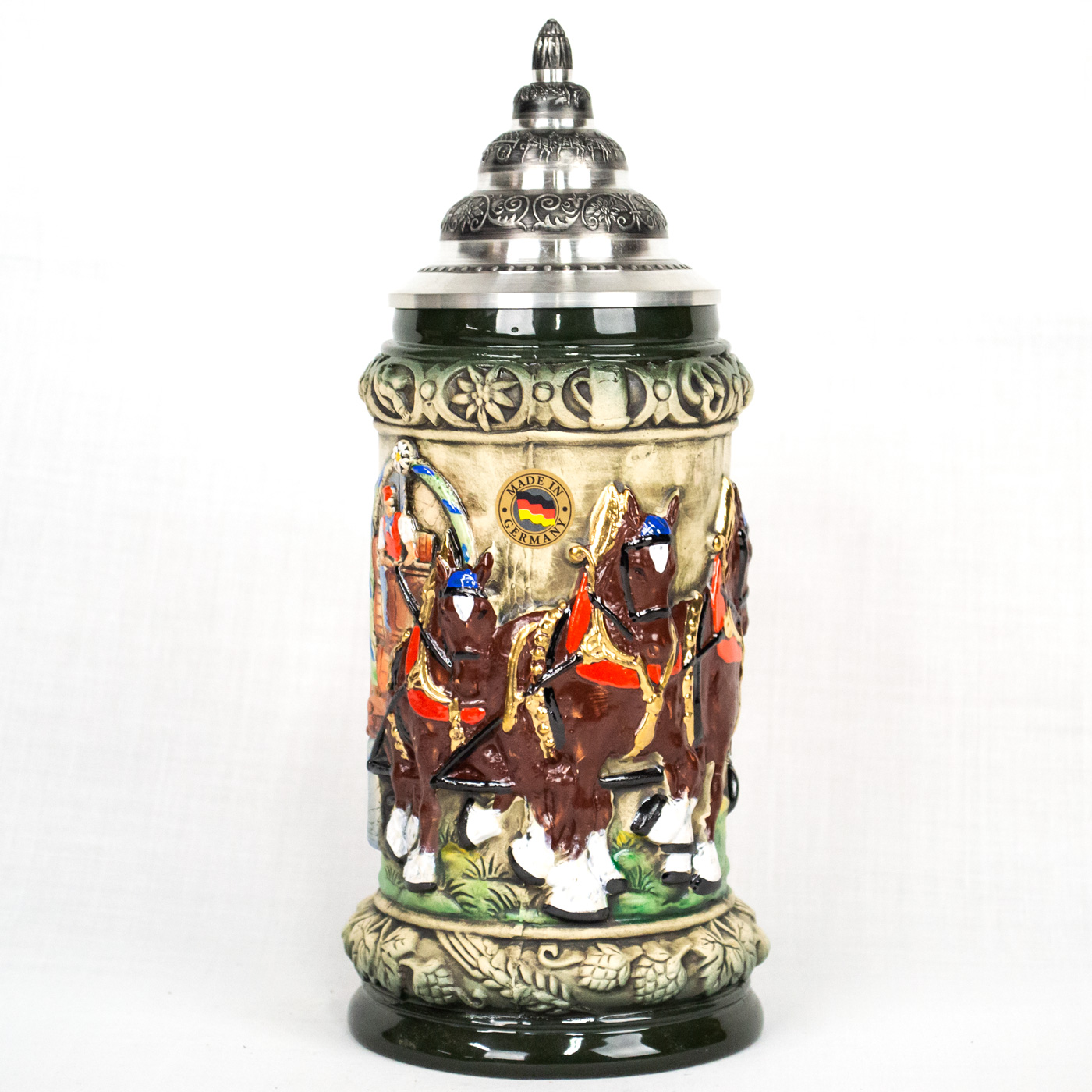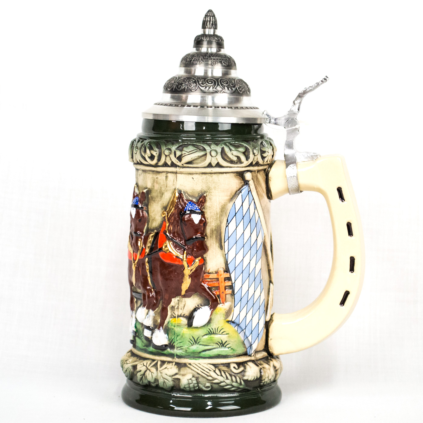 - On body of stein is a horse drawn wagon carrying beer barrels