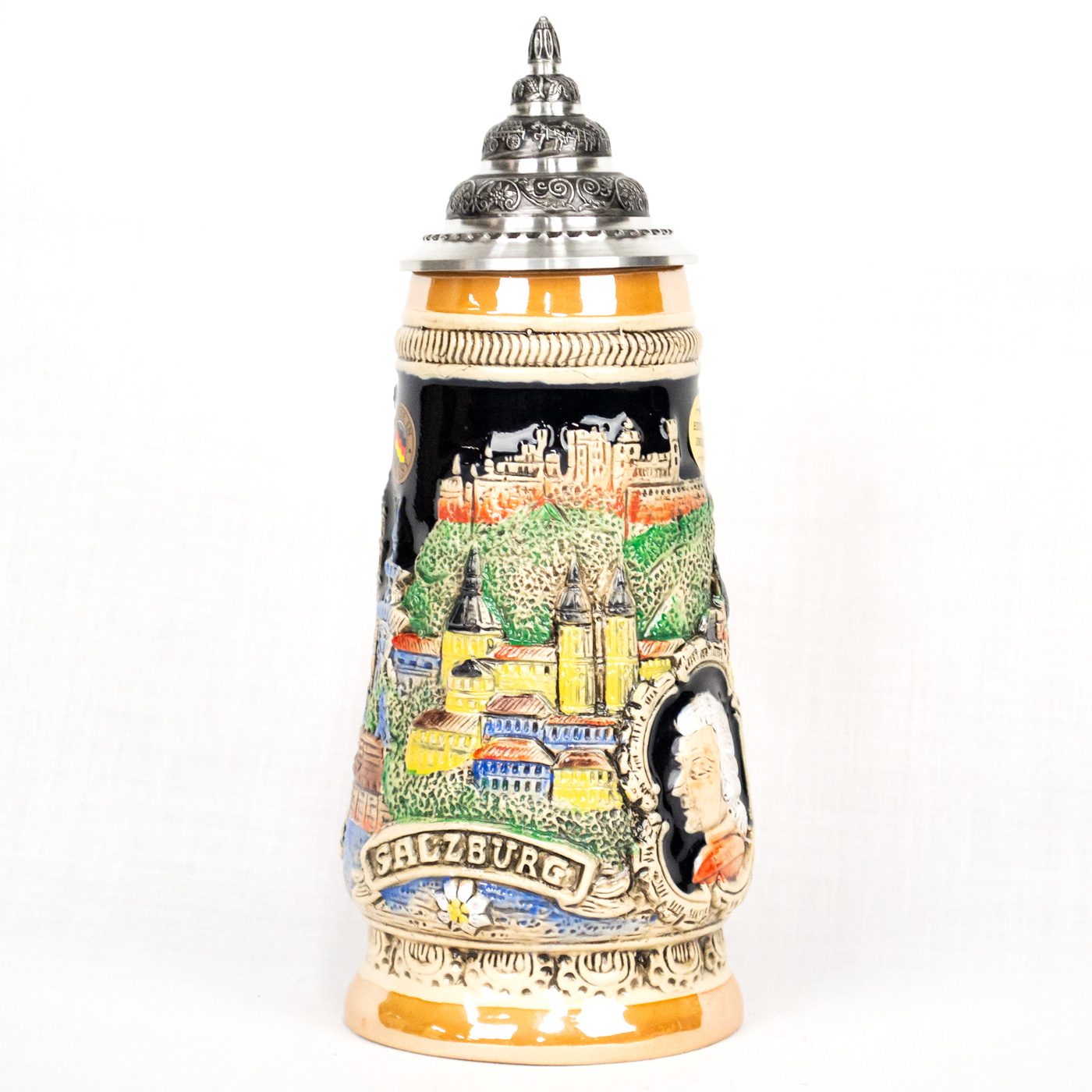 - On body of stein is a panoramic view of Salzburg with a side portrait of a man